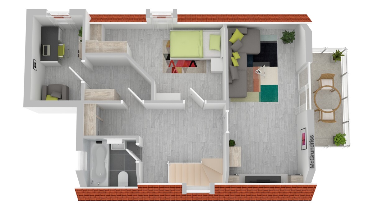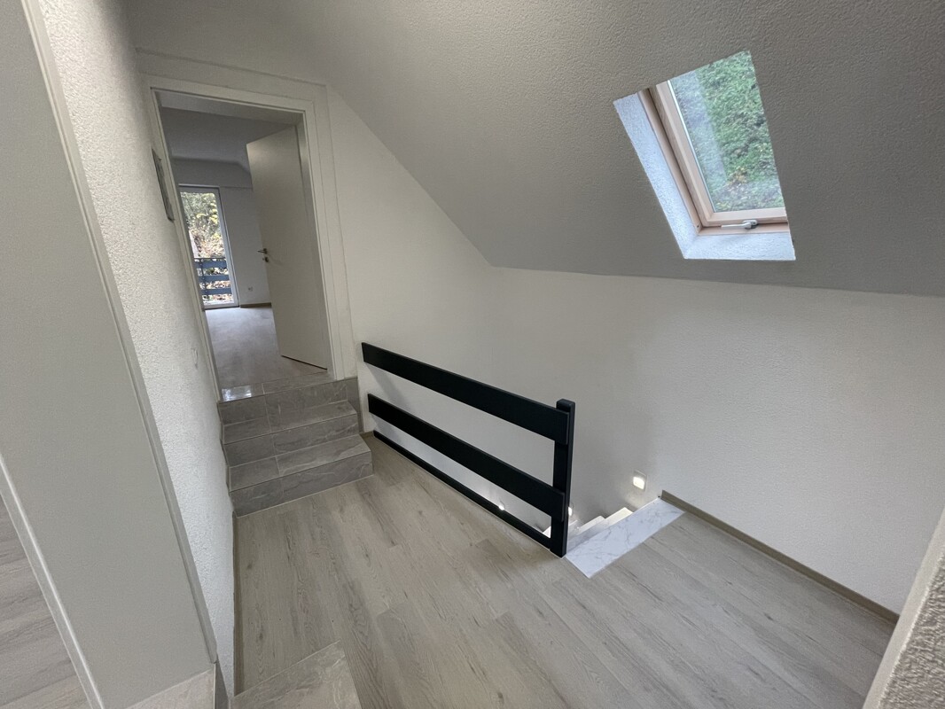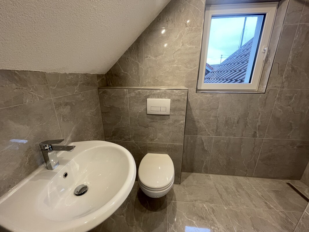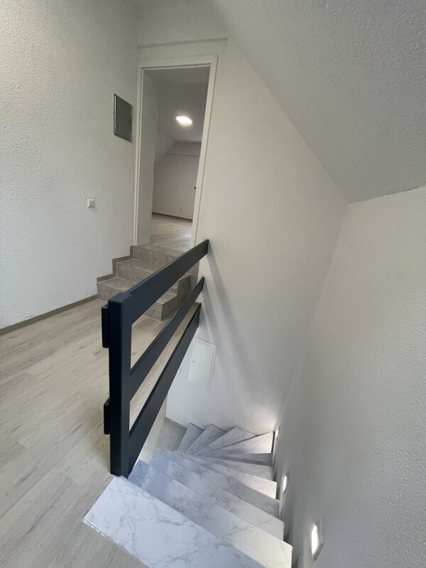 Im Obergeschoss befinden sich die Schlafzimmer, die durch ihre Größe und Helligkeit überzeugen. Die Badezimmer sind modern ausgestattet und befinden sich je eins im Erdgeschoß und eins im Obergeschoß.