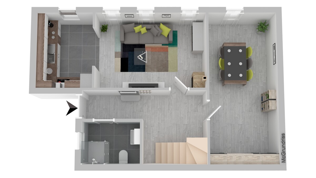 Beim Betreten des Hauses gelangen Sie in einen einladenden Flur, der Sie direkt in das geräumige Wohnzimmer führt. Große Fenster sorgen hier für viel Tageslicht und schaffen eine angenehme Wohnatmosphäre. Angrenzend befindet sich das Esszimmer und die Küche. Hier haben Sie den perfekten Platz für gesellige Abende.