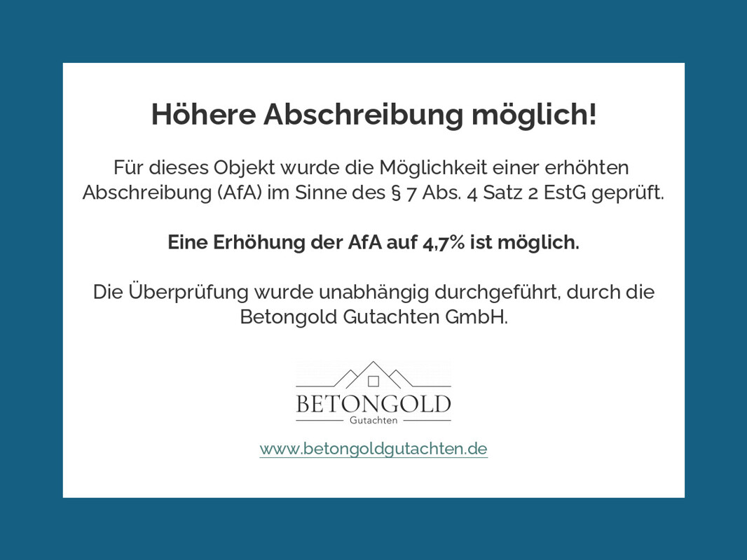 Bei diesem Objekt ist mindestens eine erhöhte AFA möglich von mindestens 4,7% jährlich !